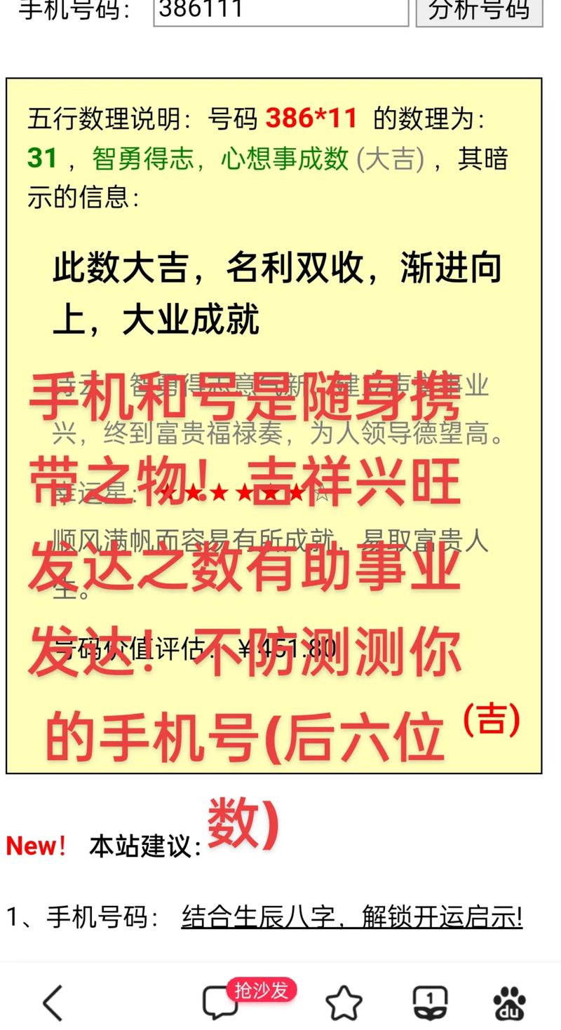 通过手机号来预测吉凶,纯粹是迷信行为,缺乏科学依据。手机号只是一个通讯工具,它的数字组合与个人命运并没有实际的关系。科学地看待自己的生活、命运以及运势,依赖于理性思维和实际行动,而非数字的排列组合。