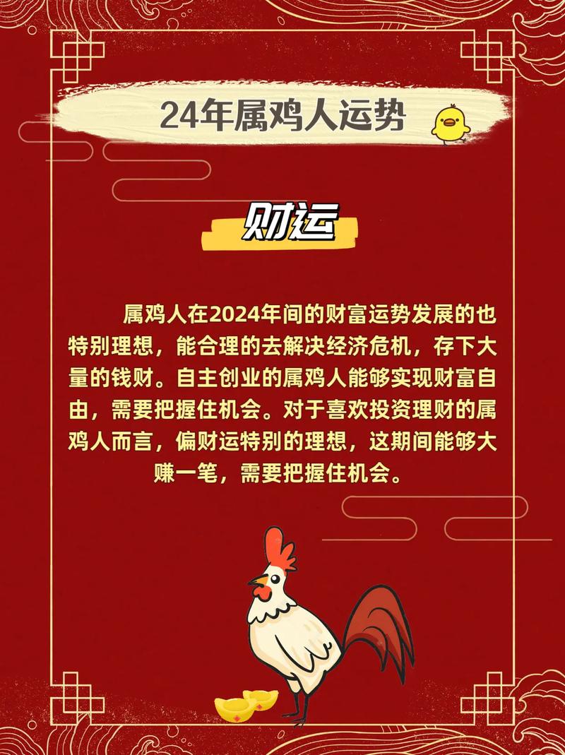 财星高照,属鸡人财运如日中天。正财稳定增长,偏财运势亦佳。投资理财有望获得丰厚回报,但仍需谨慎行事,规避风险。
