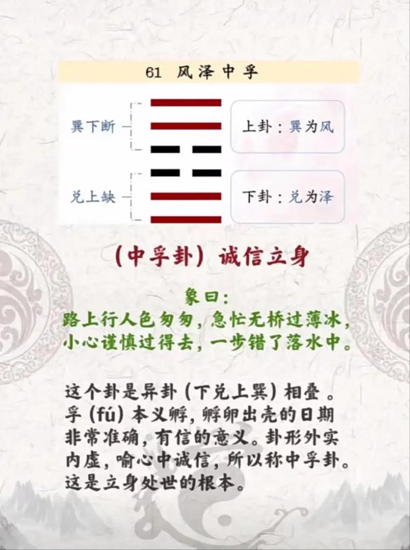 中孚卦为坤上兑下,兑为泽,坤为地,泽在上而地在下,象征着内实外虚,诚信待人。本卦主吉祥,但需谨慎行事,小心防范。