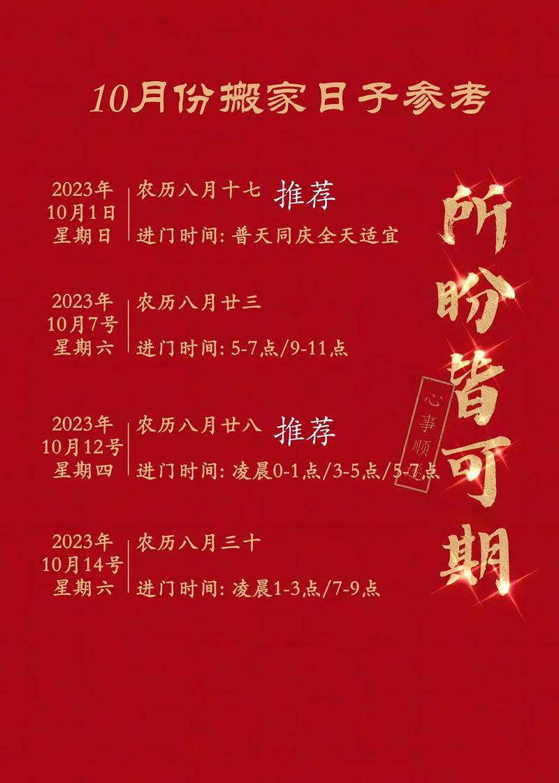 这一天是农历的九月初七,属于戊申日,是适合搬家的黄道吉日。根据黄历,这一天适合入宅、开市、交易等事务,也适合举行婚礼、祭祀等仪式。同时,这一天也是十月吉日,人们有更多的时间和精力来安排搬家,可以更好地享受假期带来的欢乐。