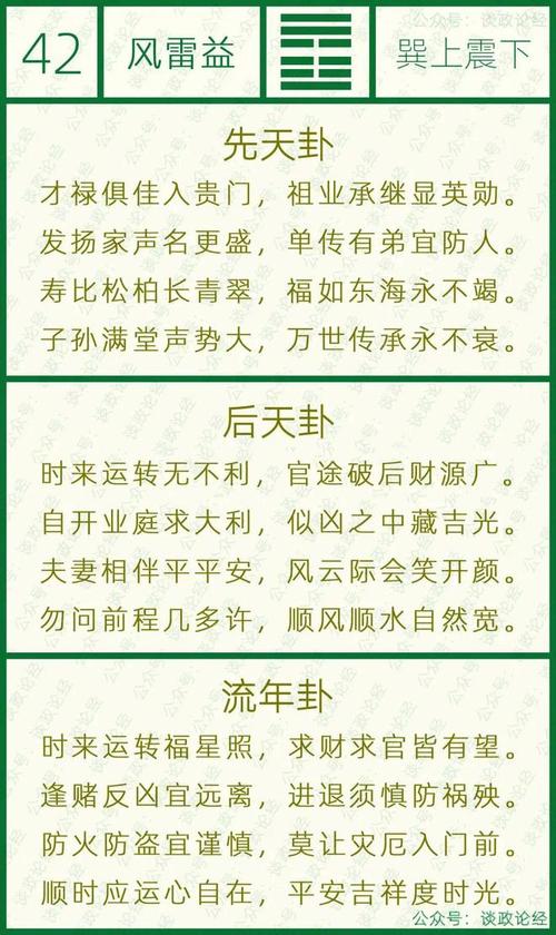 在具体的运势表现上,益卦提示的是一种“利人利己”的双赢局面。它不仅意味着个人的事业上可能获得意外的突破和丰厚的回报,还意味着团队和集体也会因合作而获得利益。处于益卦之象时,常常是一个充满机会和进取的时刻,适合主动出击、拓展视野。