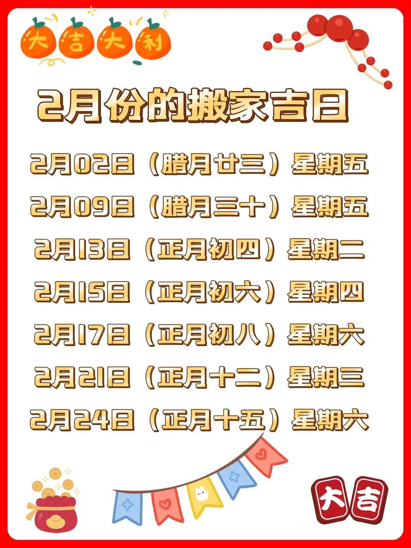 根据2024年农历二月的黄历,以下几个日期被认为是搬家的吉日,值得关注: